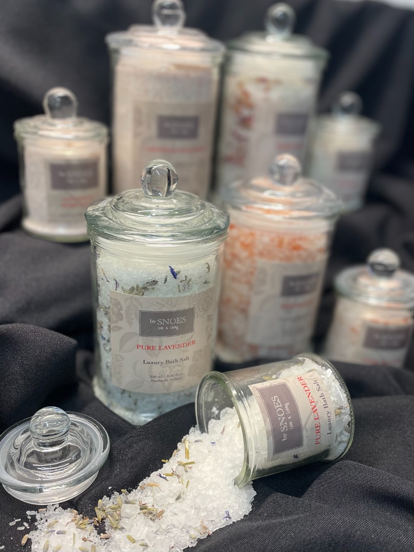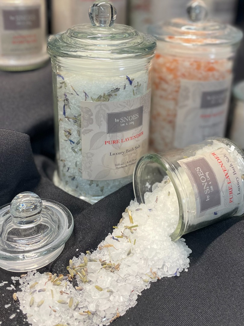 Ingrediënten: Epsom-zout, Middellandse Zeezout, etherische olie van lavendel, gedroogde lavendelknoppen.